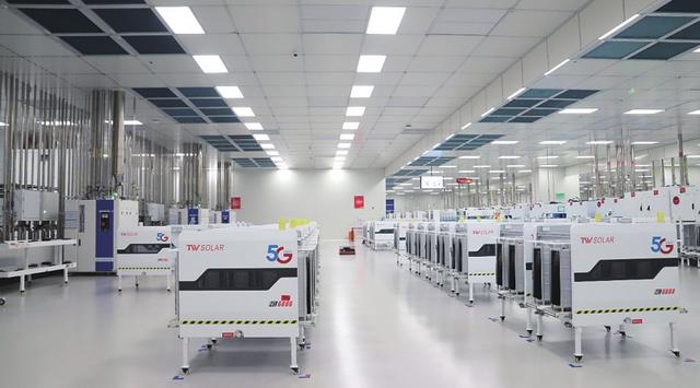 此外,通威還打造全球光伏行業(yè)首個5G智慧園區(qū)——通威太陽能成都金堂基地。基地內(nèi)擁有11個足球場大小的無塵車間,32條全自動智能制造生產(chǎn)線高效運轉(zhuǎn),數(shù)百臺智能小車來回穿梭運送物料,經(jīng)過制絨、擴散、SE激光摻雜等10道工序,每天生產(chǎn)500多萬片太陽能電池片。這里的智能制造生產(chǎn)線,與同等產(chǎn)能的傳統(tǒng)太陽能電池片生產(chǎn)線相比,用工減少約62%,能源消耗降低約30%,生產(chǎn)效率提升約161%。