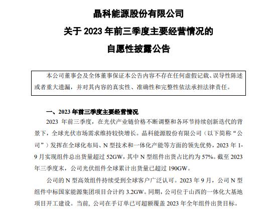 晶科能源公告稱,1-9月實現組件總出貨量超過52GW,其中N型組件出貨占比約為57%;截至2023年三季度末,公司光伏組件全球累計出貨量已超過190GW。