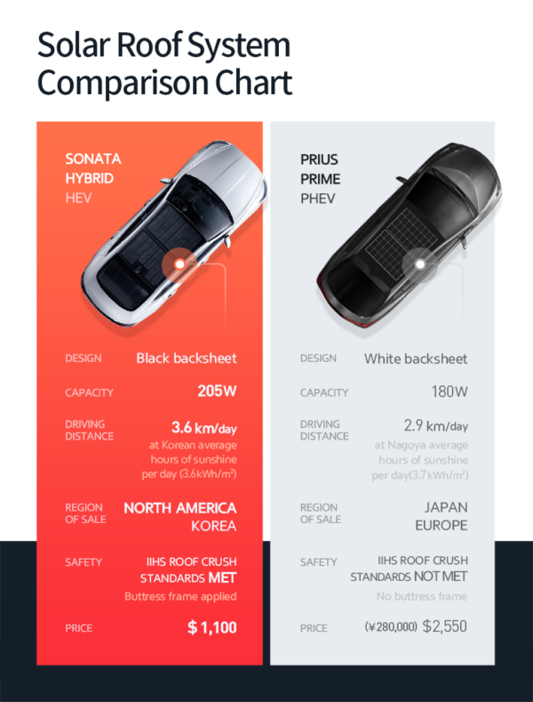 現(xiàn)代公司表示,其太陽能電池陣列系統(tǒng)與競爭對手的汽車相比具有高效的設(shè)計優(yōu)勢,如配備太陽能車頂?shù)呢S田普銳斯。普銳斯有一個單獨(dú)的太陽能電池,需要兩個階段的轉(zhuǎn)換來為高壓驅(qū)動電池和輔助“啟動”電池充電。索納塔只進(jìn)行一次轉(zhuǎn)換,直接通過電池板向最大功率點(diǎn)跟蹤器充電控制器輸送電力,并直接進(jìn)入輔助電池和驅(qū)動電池。
