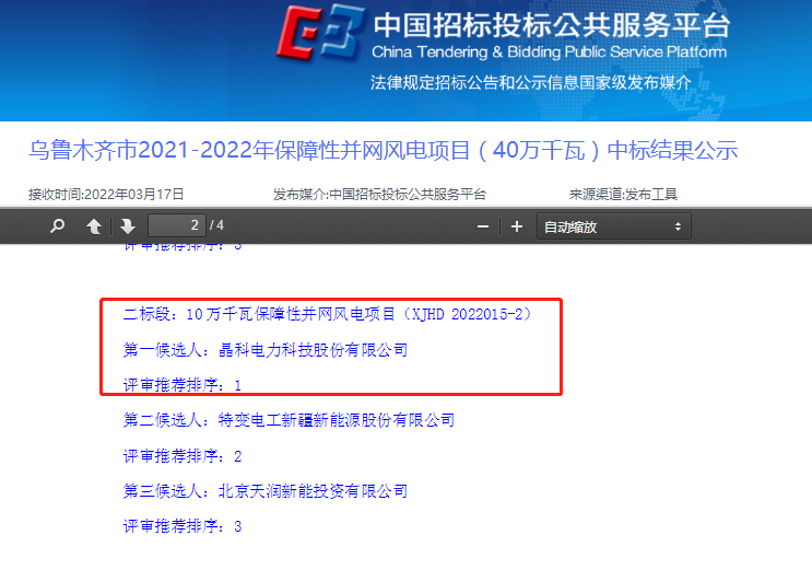 近日,烏魯木齊市2021-2022年保障性并網風電項目(40萬千瓦)中標結果公示,晶科科技(601778.SH)憑借領先的技術及良好的行業(yè)口碑,中標了其中10萬千瓦(100MW)規(guī)模的保障性并網風電項目。此次中標,是晶科科技成立以來首次獲得風電項目,也是公司推動可再生、清潔能源開發(fā)利用之路上新的里程碑,標志著公司正式進軍風電市場。