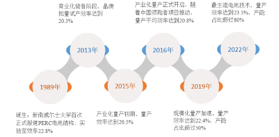 一般來(lái)講,行業(yè)內(nèi)將1989年趙建華博士首次正式公布PERC電池作為該項(xiàng)技術(shù)的起點(diǎn),但直到20多年后的2013年,通過(guò)諸多廠家與機(jī)構(gòu)長(zhǎng)期的技術(shù)儲(chǔ)備和研究,PERC技術(shù)才具備了量產(chǎn)化和商業(yè)化的基礎(chǔ),并在2015年正式啟動(dòng)大規(guī)模量產(chǎn),經(jīng)歷了幾次量產(chǎn)化加速的過(guò)程之后,自2019年起首次超越BSF技術(shù)成為最主流的光伏電池技術(shù)。圖1展示了PERC電池自誕生以來(lái)的幾個(gè)重要時(shí)間節(jié)點(diǎn)。