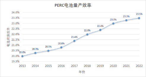 PERC電池技術(shù)具有強(qiáng)大的包容性,可以兼容各類電池技術(shù)乃至硅片端的技術(shù),在PERC技術(shù)被發(fā)明和應(yīng)用以來(lái),其量產(chǎn)效率也從開始的20%左右一路提升到現(xiàn)在的23.5%左右,單年效率最大提升幅度達(dá)0.6%,2013年以來(lái)PERC電池的量產(chǎn)效率趨勢(shì)見(jiàn)圖4。預(yù)計(jì)在未來(lái)三年,PERC的量產(chǎn)效率可以達(dá)到24%左右。
