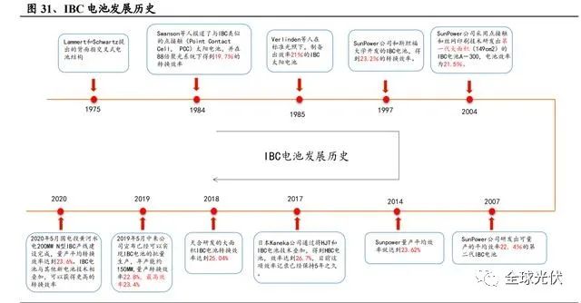 IBC 電池發(fā)展歷史:IBC 電池早最是由 Lammert 和 Schwartz 在 1975 年提出 的背面指交叉式電池結(jié)構(gòu)。美國(guó)的 Sunpower 公司是 IBC 電池的領(lǐng)軍者和開拓者, 2014 年其量產(chǎn)平均效率就達(dá)到 23.62%,2015 年實(shí)驗(yàn)室效率達(dá)到 25.2%;2018 年 天合研發(fā)的大面積 IBC 電池轉(zhuǎn)換效率達(dá)到 25.04%;2019 年 5 月中來(lái)公司宣布已 經(jīng)可以實(shí)現(xiàn) IBC 電池的批量生產(chǎn),年產(chǎn)能約 150MW,量產(chǎn)轉(zhuǎn)換效率 22.8%,最高效率 23.4%。2020 年 5 月國(guó)電投黃河水電 200MW N 型 IBC 產(chǎn)線建設(shè)完成,量產(chǎn)平均轉(zhuǎn)換效率達(dá)到 23.6%。IBC 電池與其他新電池技術(shù)相疊加,可以獲得更高的 轉(zhuǎn)換效率,2017 年 3 月,日本 Kaneka 公司通過將 HJT 和 IBC 電池技術(shù)疊加,得 到 HBC 電池,效率達(dá)到 26.7%,目前這項(xiàng)效率記錄已經(jīng)保持 5 年之久。
