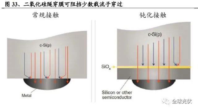 二氧化硅+摻雜多晶硅:隧穿作用和鈍化作用。二氧化硅隧穿膜最佳厚度在 1.2nm,其作用在于使多數(shù)載流子(電子)通過隧穿效應(yīng)穿過氧化層,但少數(shù)載流 子(空穴)被阻擋,從而進(jìn)一步降低了載流子復(fù)合效應(yīng)。摻雜多晶硅層一方面起到保護(hù)二氧化硅層的作用,另一方面會(huì)增加電子或空穴在氧化硅中的隧穿概率, 因此,多晶硅層的摻雜濃度越高,太陽(yáng)能電池的開路電壓和效率就越高。