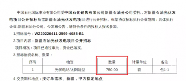 2022年4月1日,中國石化銷售有限公司新疆石油分公司公開招標750套新疆石油光伏發(fā)電項目。