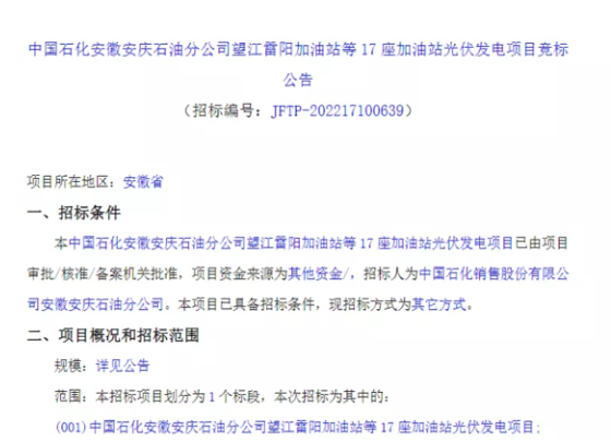 2022年9月28日,中國石化安徽安慶石油分公司望江雷陽加油站等17座加油站光伏發(fā)電項目競標公告發(fā)布: