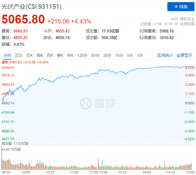 11月4日,光伏板塊全線大漲,中證光伏產(chǎn)業(yè)指數(shù)(CSI:931151)報收5066點(diǎn),漲幅達(dá)到4.43%。