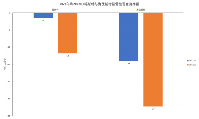 而且,隨著經(jīng)營規(guī)模的擴(kuò)大,企業(yè)的營運(yùn)壓力也不斷提升。截至2022Q3,福斯特和海優(yōu)新材的應(yīng)收賬款較2021年全年提高32%和52%,預(yù)付款項(xiàng)提高195%和347%。而流動比率則下降53%和25%,經(jīng)營性現(xiàn)金流更是呈凈流出態(tài)勢,且規(guī)模顯著提升,分別達(dá)到11.76億元和27.20億元,降幅高達(dá)695%和94%。