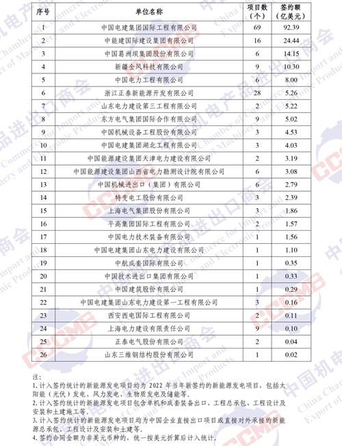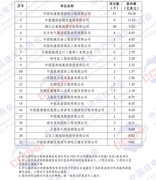 日前,中國(guó)機(jī)電產(chǎn)品進(jìn)出口商會(huì)發(fā)布2022年境外電力項(xiàng)目簽約排行榜。根據(jù)中國(guó)機(jī)電商會(huì)統(tǒng)計(jì),2022年,中國(guó)企業(yè)參與境外電力項(xiàng)目投(議)標(biāo)并最終實(shí)現(xiàn)簽約的項(xiàng)目517個(gè),簽約合同總金額339.93億美元,總裝機(jī)容量約33.5GW。根據(jù)各重點(diǎn)企業(yè)報(bào)送的2022年境外電力項(xiàng)目的新簽約情況,中國(guó)機(jī)電商會(huì)對(duì)企業(yè)簽約額進(jìn)行了排名。現(xiàn)將企業(yè)排名及火電、水電、輸變電、新能源(太陽(yáng)能、風(fēng)、生物質(zhì)、儲(chǔ)能等)及太陽(yáng)能(光伏)、風(fēng)電行業(yè)簽約排名予以發(fā)布。