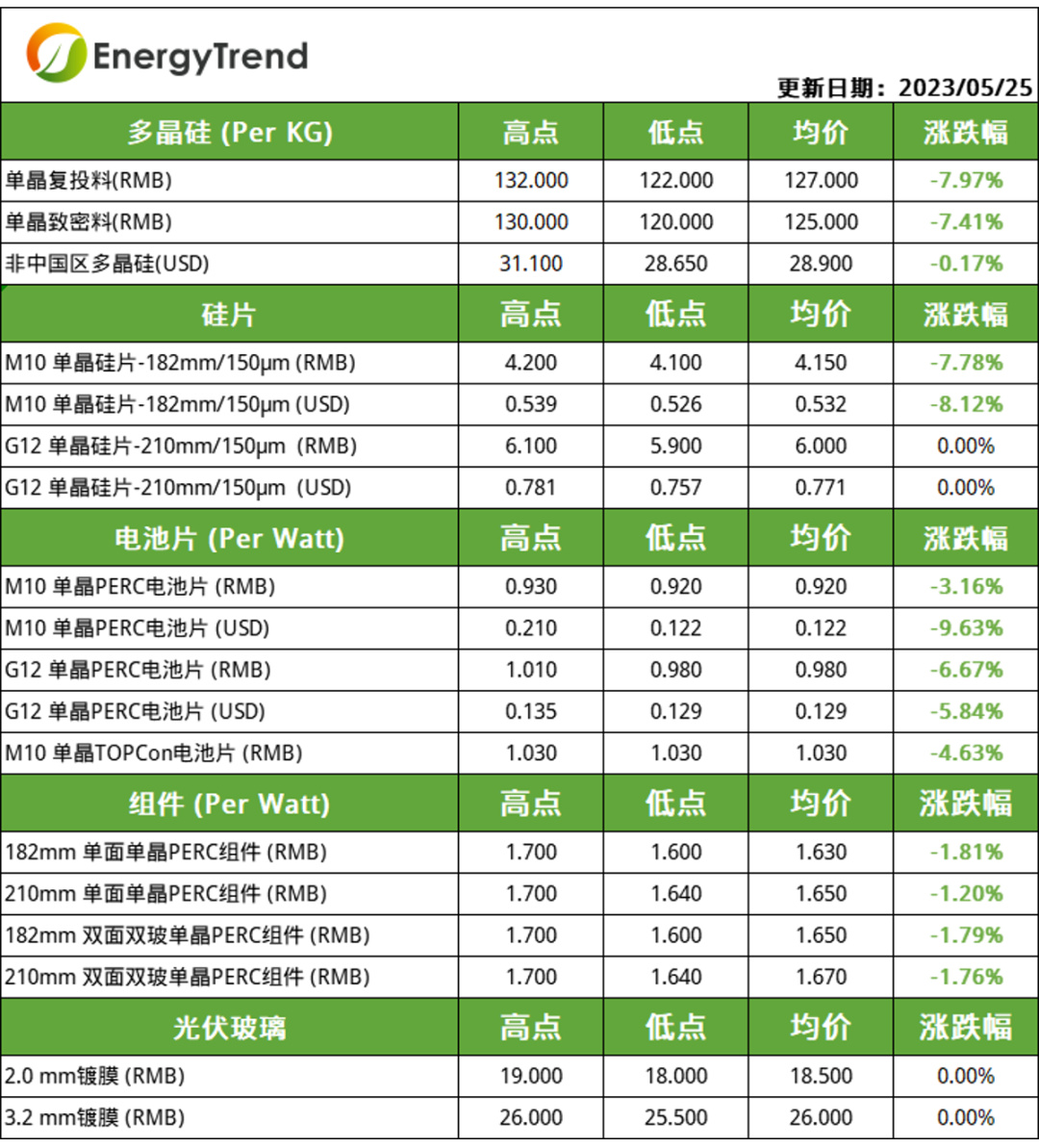 本周組件價(jià)格下滑明顯,182單晶單面PERC組件主流成交價(jià)為1.63元/W,210單晶單面PERC組件主流成交價(jià)為1.65元/W,182雙面雙玻單晶PERC組件成交價(jià)為1.65元/W,210雙面雙玻單晶PERC組件主流成交價(jià)為1.67元/W。