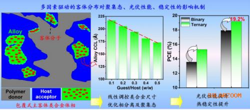 進(jìn)一步,研究對外圍功能化的客體分子主骨架進(jìn)行再調(diào)控,獲得了高質(zhì)量的類合金體相,同時(shí),類合金聚集體的晶域尺寸可以通過客體摻雜比例進(jìn)行線性調(diào)控(圖2)。相比受體相內(nèi)同時(shí)存在客體自聚集區(qū)域及類合金區(qū)域,該研究中客體分子與主體受體具有高度兼容性。實(shí)驗(yàn)結(jié)果分析顯示幾乎所有的客體分子均參與類合金體相的構(gòu)建,這是類合金晶域尺寸可以線性調(diào)控的本質(zhì)原因。同時(shí),客體分子摻雜后,無論是主體聚合物給體還是主體受體的結(jié)晶性均得到增強(qiáng),促進(jìn)了垂直方向空穴和電子的傳輸。此外,客體分子形成的類合金聚集體均包覆在主體受體相內(nèi),形成了核殼結(jié)構(gòu)(主體包覆客體),增強(qiáng)了主客體之間的能量轉(zhuǎn)移。對于這種獨(dú)特的聚集態(tài)結(jié)構(gòu),研究首次提出了具有普適性的主客體結(jié)晶性、表面能、兼容性相互關(guān)系以及給受體相互作用四要素協(xié)同作用的驅(qū)動機(jī)制。此類獨(dú)特的主客體聚集態(tài)及分子堆積,對于提高電荷傳輸、抑制電荷復(fù)合起到重要作用。研究將其作為客體分子進(jìn)行摻雜,在多個(gè)體系中實(shí)現(xiàn)了超過80%的填充因子(最高達(dá)到81.1%)和19.2%的高能量轉(zhuǎn)換效率。除了效率提升外,研究再次發(fā)現(xiàn)類合金體相的形成明顯改善了OSC的穩(wěn)定性,驗(yàn)證了類合金體相對抑制亞穩(wěn)態(tài)形成、提高光伏電池穩(wěn)定性的作用。