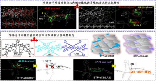 該研究優(yōu)化受體分子側(cè)鏈功能基團(tuán)的位置(圖1),將face-to-face/face-to-edge混合取向堆積的客體分子轉(zhuǎn)換為100% face-to-face優(yōu)勢取向,提高了垂直方向的電子傳輸性能。單晶解析和相關(guān)理論分析發(fā)現(xiàn),側(cè)鏈外圍功能化的分子可以通過外圍共軛平臺與相鄰受體分子骨架形成緊密的π-π相互作用,使分子取向?qū)崿F(xiàn)定向錨定。而相對于功能化基團(tuán)在內(nèi)側(cè)的客體分子,外圍功能化的客體與主體受體之間形成類合金聚集態(tài),呈現(xiàn)出更為規(guī)整的分子排列與取向,降低了受體相內(nèi)的缺陷密度及復(fù)合損失。摻雜后的OSC光伏效率達(dá)到19.12%,且類合金體相在熱力學(xué)上更趨向于平衡態(tài),OSC的熱穩(wěn)定性得到明顯提升。因此,調(diào)控?fù)诫s客體分子的堆積取向及主客體相互作用,對獲得合適相分離、抑制亞穩(wěn)態(tài)生成、提升光伏電池穩(wěn)定性具有積極作用。