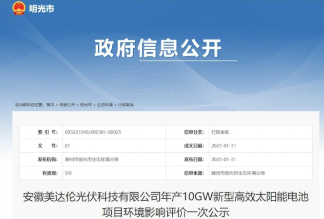 2023年1月31日,滁州市明光市生態(tài)環(huán)境分局發(fā)布了安徽美達(dá)倫光伏科技有限公司年產(chǎn)10GW新型高效太陽能電池項目環(huán)境影響評價一次公示,安徽省明光市產(chǎn)城新區(qū)擬建設(shè)年產(chǎn)10GW新型高效太陽能電池項目。