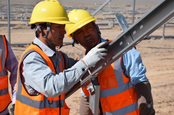 在樁基施工過程中,克服作業(yè)面環(huán)境惡劣、氣溫高紫外線強(qiáng)、常伴有沙塵暴等因素,以每日、每周為節(jié)點(diǎn)嚴(yán)格落實(shí)施工部署,優(yōu)化工序施工方案,采取測(cè)量放點(diǎn)精準(zhǔn)定位,樁位中心清晰標(biāo)識(shí),樁機(jī)安裝水平尺,專人盯控預(yù)埋件,有效避免樁位、樁身垂直度、樁長(zhǎng)、樁頂標(biāo)高、預(yù)埋件定位等工序風(fēng)險(xiǎn)點(diǎn)出現(xiàn),5月27日優(yōu)質(zhì)完成樁基混凝土澆筑,為項(xiàng)目安全快速推進(jìn)奠定了堅(jiān)實(shí)的基礎(chǔ)。8月12日,玉門40萬千瓦光伏發(fā)電工程項(xiàng)目首批次光伏板順利安裝,項(xiàng)目正式進(jìn)入電氣安裝階段,同時(shí)開啟了建設(shè)目標(biāo)“加速度”。10月30日項(xiàng)目提前40天順利完工。