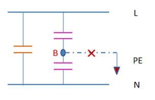 當兩個Y電容無差異時,兩個電容可被看作高阻抗的分壓電阻,B點的電壓等于交流電壓220V的一半,即110VAC。此時用電筆去測機殼,電筆指示燈亮的原因就是機殼帶了110VAC的電。因為Y電容的個體差異,以及現(xiàn)場環(huán)境等因素,用萬用表實測機殼對地的電壓大多在100-220VAC之間,此時觸碰機殼會有麻麻的感覺。當然,受環(huán)境干濕、鞋子絕緣等情況影響,人體感受也不盡相同。