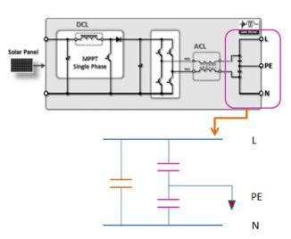 上圖中,L-PE以及N-PE間的電容被稱為Y電容,L-N間的電容被稱為X電容,X電容與Y電容也被叫做安全電容。做此設計的出發(fā)點,就是利用電容隔直通交的特性,把外界干擾和內部產生的一些高頻輻射,通過電容——地線的路徑進行濾除,從而增加逆變器的電磁兼容性。