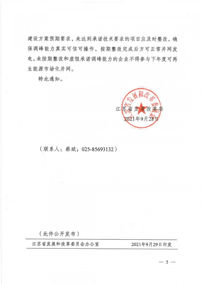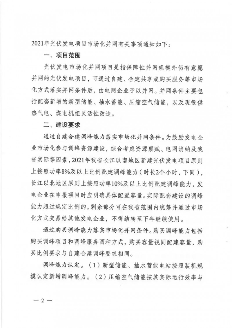根據文件,2021年江蘇省長江以南地區(qū)新建光伏發(fā)電項目原則上按照功率8%及以上比例配建調峰能力(時長2小時,下同),長江以北地區(qū)原則上按照功率10%及以上比例配建調峰能力;調峰能力超過規(guī)定比例的,剩余部分可在江蘇省范圍內統籌并通過市場化方式交易給其他發(fā)電企業(yè)。