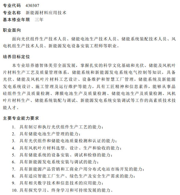 在中等職業(yè)教育中,包括光伏工程技術(shù)與應(yīng)用專業(yè)、太陽能與沼氣技術(shù)利用兩個(gè)專業(yè)。高等職業(yè)教育??茖I(yè)中,包括光伏工程技術(shù)、新能源材料應(yīng)用技術(shù)兩個(gè)專業(yè)。高等職業(yè)教育本科專業(yè)中僅有新能源材料應(yīng)用技術(shù)一個(gè)相關(guān)專業(yè)。