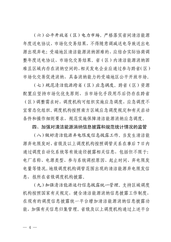 第三部分是加強(qiáng)對(duì)清潔能源跨?。▍^(qū))消納情況監(jiān)管。包括公平開放?。▍^(qū))電力市場(chǎng)、規(guī)范清潔能源跨?。▍^(qū))應(yīng)急調(diào)度。要求嚴(yán)格落實(shí)省間清潔能源年度送電協(xié)議、市場(chǎng)化交易結(jié)果,不得隨意調(diào)減送電導(dǎo)致送出電源出現(xiàn)棄電。存在消納困難的,發(fā)電企業(yè)通過(guò)市場(chǎng)化交易促進(jìn)消納。調(diào)度機(jī)構(gòu)要按照南方區(qū)域應(yīng)急調(diào)度規(guī)定的啟動(dòng)條件和操作細(xì)則要求,規(guī)范實(shí)施保障清潔能源消納應(yīng)急調(diào)度。