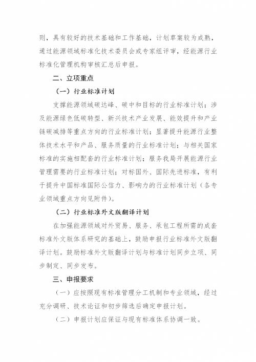 文件明確,突出能源行業(yè)標(biāo)準(zhǔn)的公益性,對(duì)沒(méi)有國(guó)家標(biāo)準(zhǔn)而又需要在能源行業(yè)范圍內(nèi)統(tǒng)一的,提出能源行業(yè)標(biāo)準(zhǔn)計(jì)劃。屬于競(jìng)爭(zhēng)性的、一般性的技術(shù)要求,原則上不作為能源行業(yè)標(biāo)準(zhǔn)計(jì)劃。