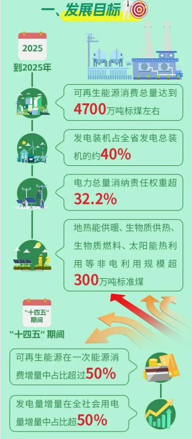 ——可再生能源發(fā)電目標(biāo)。2025年,可再生能源發(fā)電裝機達到5500萬千瓦以上,占全省發(fā)電總裝機的40%左右;可再生能源年發(fā)電量達到1000億千瓦時左右?!笆奈濉逼陂g,可再生能源發(fā)電量增量在全社會用電量增量中的占比超過50%。