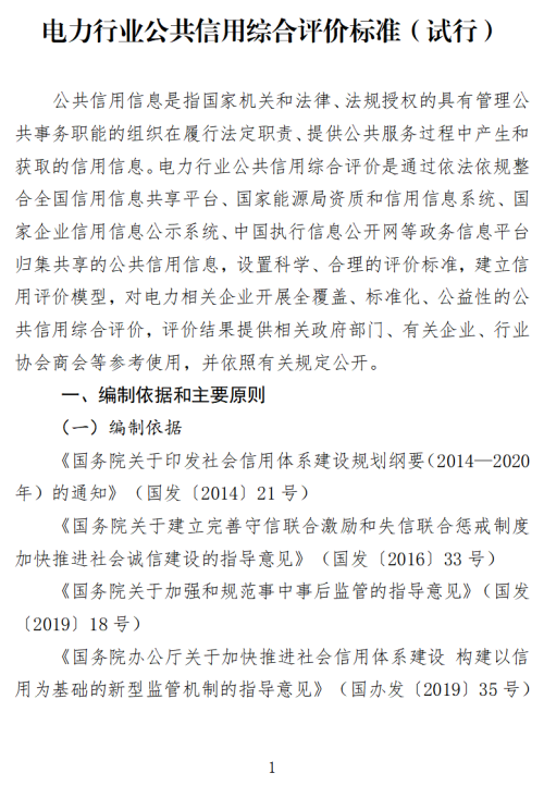 為貫徹落實(shí)黨中央、國務(wù)院關(guān)于推進(jìn)社會信用體系建設(shè)高質(zhì)量發(fā)展的決策部署,進(jìn)一步強(qiáng)化電力行業(yè)信用分級分類監(jiān)管,我局編制了《電力行業(yè)公共信用綜合評價標(biāo)準(zhǔn)(試行)》,現(xiàn)予印發(fā)實(shí)施。試行中,請結(jié)合工作實(shí)際,及時反饋出現(xiàn)的新情況新問題,以便持續(xù)改進(jìn)完善,切實(shí)提升監(jiān)管效能和服務(wù)水平。