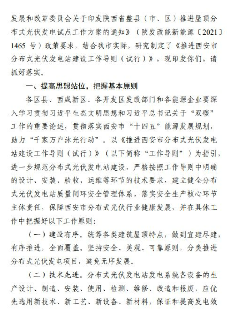 9月21日,西安市發(fā)改委發(fā)布《推進西安市分布式光伏電站建設(shè)工作導則(試行)》的通知,分布式光伏發(fā)電站可采用“自發(fā)自用”“自發(fā)自用,余電上網(wǎng)”或者“全額上網(wǎng)”等并網(wǎng)模式,所有新建、擴建或改建的分布式光伏發(fā)電站,履行項目備案、設(shè)計、安裝和驗收程序;戶用(自然人)分布式光伏發(fā)電站裝機容量原則上不超過50kW,且不得超過超出宅基地范圍;非自然人分布式光伏發(fā)電站單點并網(wǎng)裝機容量不超過6000kW,整村開發(fā)模式在電網(wǎng)無消納受限的區(qū)域,不設(shè)容量規(guī)模限制。
