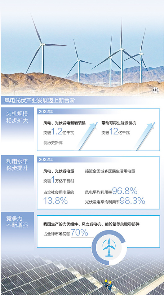 出口總額超過512億美元,同比增長80.3%——2022年,我國光伏產(chǎn)業(yè)在國際市場(chǎng)的表現(xiàn)亮眼。歷經(jīng)多年深耕細(xì)作,我國風(fēng)電光伏產(chǎn)業(yè)競(jìng)爭(zhēng)力大幅提升,光伏組件、風(fēng)力發(fā)電機(jī)、齒輪箱等關(guān)鍵零部件占全球市場(chǎng)份額的比重提升至70%。在國內(nèi),風(fēng)電光伏也已成為新增發(fā)電裝機(jī)和新增發(fā)電量的主體,2022年占比分別達(dá)到78%和55%以上,累計(jì)裝機(jī)突破7億千瓦,相當(dāng)于30多個(gè)三峽電站。