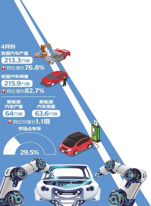 伴隨宏觀經(jīng)濟(jì)持續(xù)恢復(fù)向好,市場(chǎng)需求逐步回暖,汽車消費(fèi)需求有望進(jìn)一步釋放。中汽協(xié)發(fā)布數(shù)據(jù)顯示,4月份,我國(guó)汽車產(chǎn)銷分別完成213.3萬(wàn)輛和215.9萬(wàn)輛,同比分別增長(zhǎng)76.8%和82.7%。其中,新能源汽車產(chǎn)銷和汽車出口延續(xù)良好態(tài)勢(shì)。