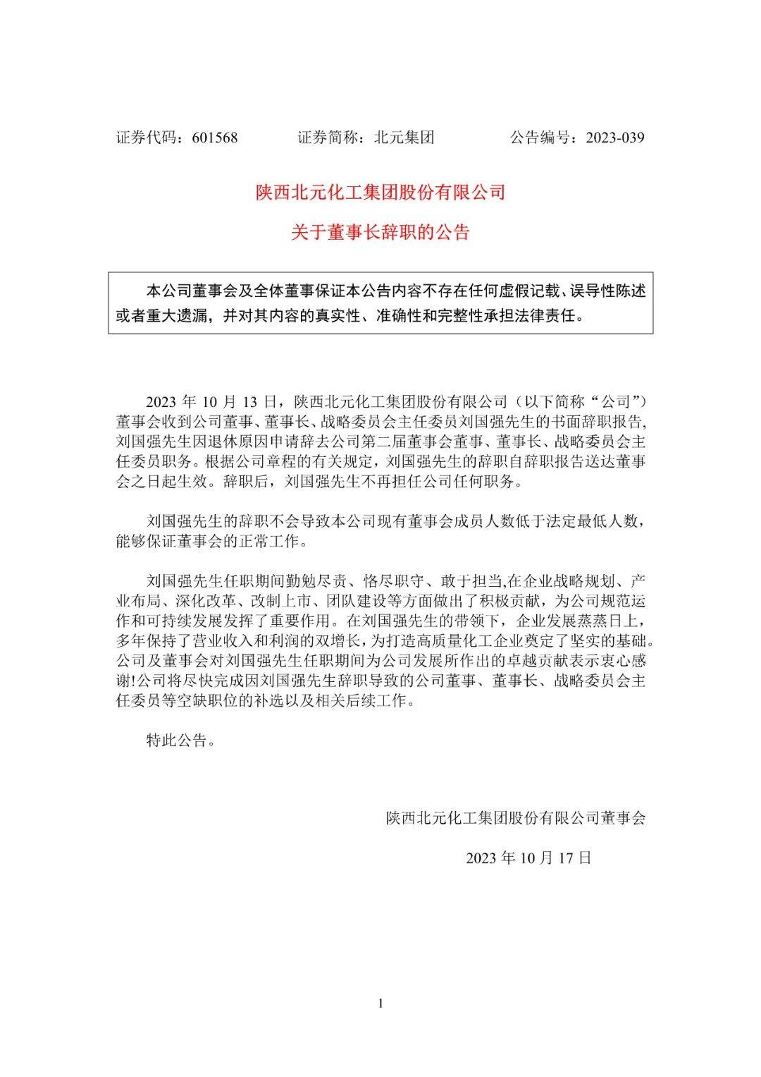 劉國強(qiáng)辭去陜西北元化工集團(tuán)股份有限公司(簡稱“北元集團(tuán)”)第二屆董事會董事、董事長、戰(zhàn)略委員會主任委員職務(wù)。