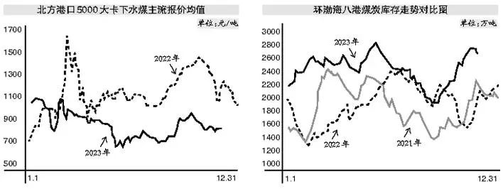 從10月中旬開始,市場煤價(jià)格進(jìn)入一個(gè)回落期,下跌趨勢一直延續(xù)到11月初。價(jià)格回落后,貿(mào)易商看漲情緒升溫,詢貨有所增多,加上第一次寒流來襲且水電進(jìn)入快速回落期,煤炭市場受到一定帶動,價(jià)格企穩(wěn)反彈。隨后在高庫存的壓制下,市場情緒又開始轉(zhuǎn)弱。進(jìn)入11月下旬,當(dāng)港口5000大卡下水煤價(jià)格再次回落至每噸800元左右時(shí),供應(yīng)方出貨意愿降低,疊加第二波寒潮降溫來臨,市場對電廠日耗回升有一定預(yù)期,價(jià)格小幅反彈。但這波寒潮影響時(shí)間較短,后續(xù)多地氣溫有所回升,且沿海地區(qū)受影響較小,電廠日耗環(huán)比增速略有放緩。電廠在高庫存的情況下,對高價(jià)接受程度有限,疊加港口高庫存疏港壓力加大,市場煤價(jià)格反彈支撐不足,短暫上漲后開始企穩(wěn)。