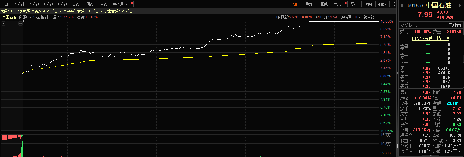 11月25日萬億巨頭中國石油實現(xiàn)漲停,為2015年7月以來首次。截至收盤,漲幅為10.06%,股價報7.99元,市值達1.46萬億,成交金額為29.10億元。
