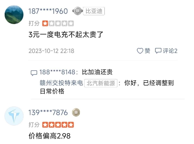 但是在評論區(qū)里,有多名不同手機(jī)號的用戶吐槽“電價過貴”的發(fā)言。2023年10月15日左右,先后有幾名網(wǎng)友責(zé)怪:“價格偏高2.98元”“3元一度電充不起太貴了”……當(dāng)時,贛州交投特來電于去年10月13日回復(fù)道:已經(jīng)調(diào)整到日常價格。
