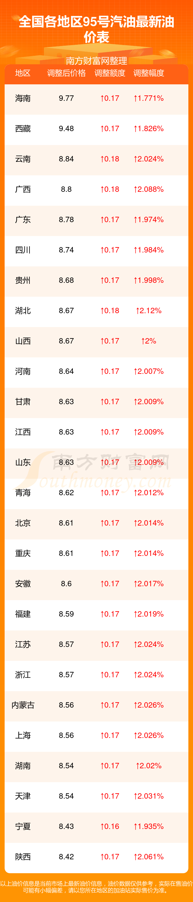 全國95號汽油4月2日的最新價格是4月2日油價調整后的價格,詳情如下:平均價格為9元/升,最低的是陜西,價格8.42元/升,最高的是海南,價格9.77元/升。