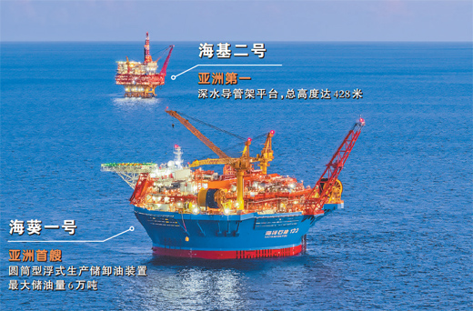 這一天,兩個“能源重器”——亞洲首艘圓筒型浮式生產(chǎn)儲卸油裝置(FPSO)“??惶?rdquo;、亞洲第一深水導(dǎo)管架平臺“?;?rdquo;攜手上崗,標志著我國全類型深水油氣裝備的設(shè)計、建造和安裝能力達到世界一流水平。