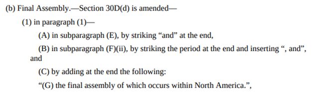 其中之一即下圖中(G)條款,車輛的總裝須發(fā)生在北美地區(qū)之內(nèi)。