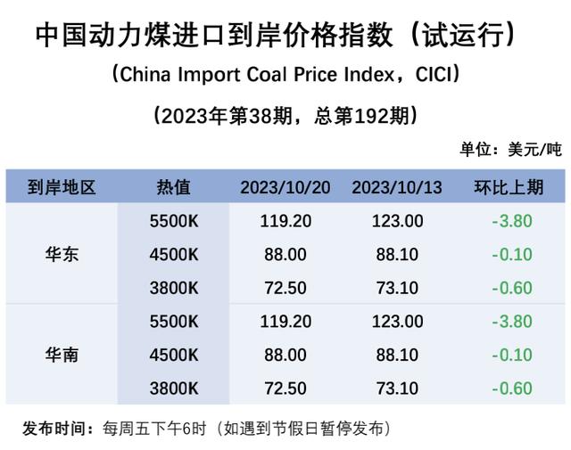 截至10月20日,5500K華東和華南到岸價(jià)均為119.20美元/噸,較上期下跌3.80美元/噸,較國內(nèi)煤價(jià)低20-25元/噸;4500K華東和華南到岸價(jià)均為88.00美元/噸,較上期下跌0.10美元/噸,與國內(nèi)煤價(jià)低20-25元/噸;3800K華東和華南到岸價(jià)均為72.50美元/噸,較上期下跌0.60美元/噸,較國內(nèi)煤價(jià)低10-15元/噸。(理論測(cè)算,僅供參考)。
