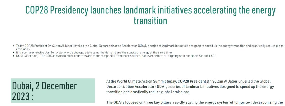COP28 主席蘇丹·賈比爾周六宣布了“全球脫碳加速計劃”(GDA),該計劃專注于三個關鍵支柱:快速擴展未來的能源系統(tǒng);促進當今的能源系統(tǒng)脫碳;并針對甲烷和其他非二氧化碳溫室氣體 (GHG)的行動。