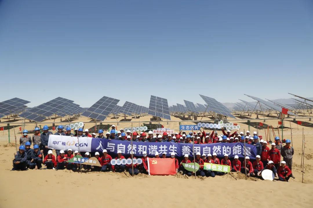 6月5日,第50個世界環(huán)境日之際,中國廣核集團(簡稱中廣核)在內(nèi)蒙古庫布其沙漠朔方光伏電站組織開展“百人植樹”活動。兩年多以來,通過“板上發(fā)電、板下種植、板間養(yǎng)殖”的立體化新型產(chǎn)業(yè)循環(huán)方案,中廣核已在庫布其沙漠實現(xiàn)有效治沙2.7萬畝。
