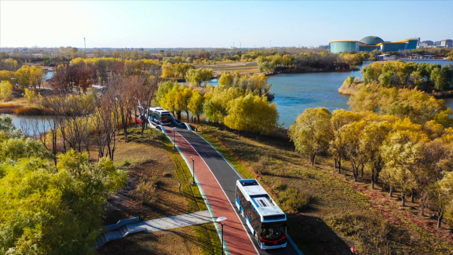 在吉林省白城市生態(tài)新區(qū)鶴鳴湖公園行駛的氫能公交車(2020年10月21日攝)。(受訪對(duì)象供圖)