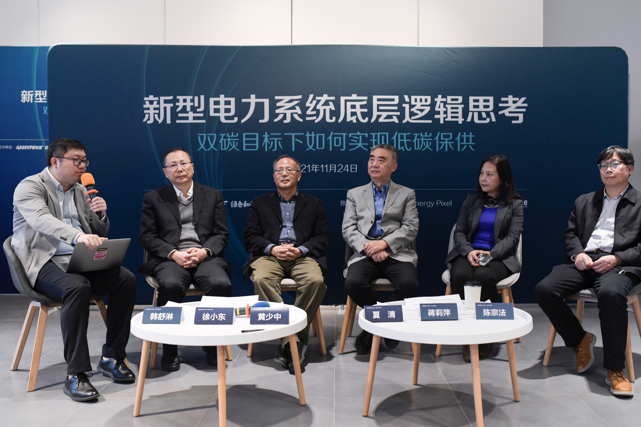 從左至右依次為:《財經(jīng)雜志》記者韓舒淋、電力規(guī)劃設(shè)計總院高級顧問徐小東、中國能源研究會研究員黃少中、清華大學(xué)能源互聯(lián)網(wǎng)智庫研究中心主任夏清教授、國網(wǎng)能源研究院副院長蔣莉萍、中國能源研究會理事陳宗法。