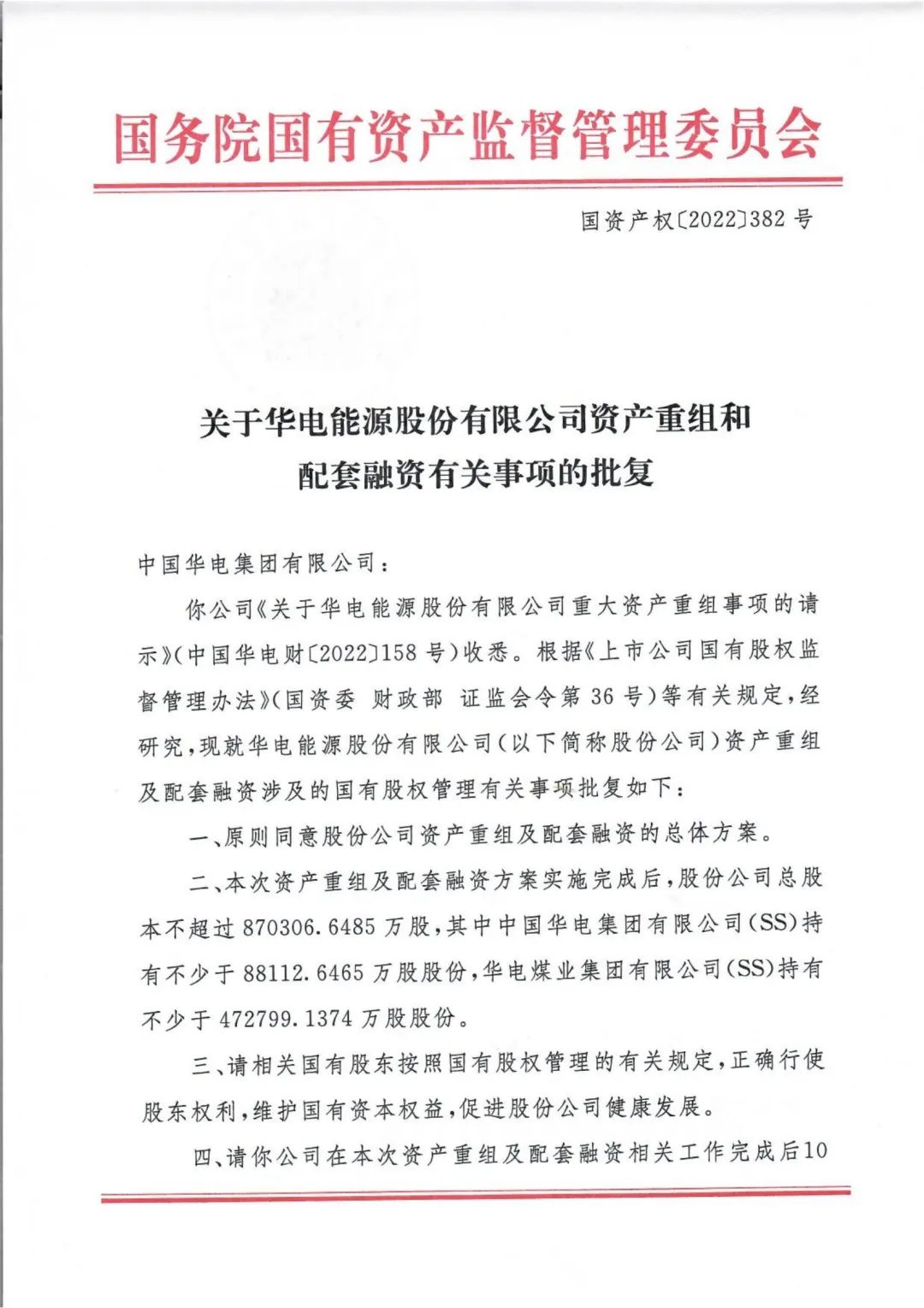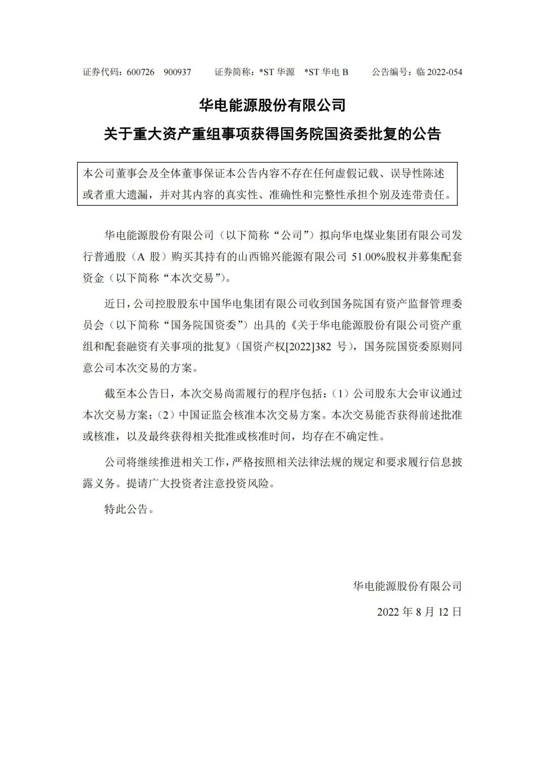 華電能源也發(fā)布公告,確認重大資產(chǎn)重組事項獲得國務(wù)院國資委批復(fù)。