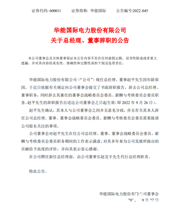 9月27日,華能國際發(fā)布關(guān)于總經(jīng)理、董事辭職的公告。華能國際現(xiàn)任總經(jīng)理、董事趙平先生因年齡原因,于近日依據(jù)有關(guān)規(guī)定向公司董事會提交了書面辭職報告,辭去公司總經(jīng)理、董事職務(wù),同時辭去其兼任的董事會戰(zhàn)略委員會委員、薪酬與考核委員會委員職務(wù)。趙平先生的辭職報告自送達(dá)公司董事會之日起生效(即2022年9月26日)。