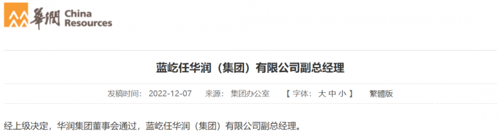 12月7日,經上級決定,華潤集團董事會通過,藍屹任華潤(集團)有限公司副總經理。
