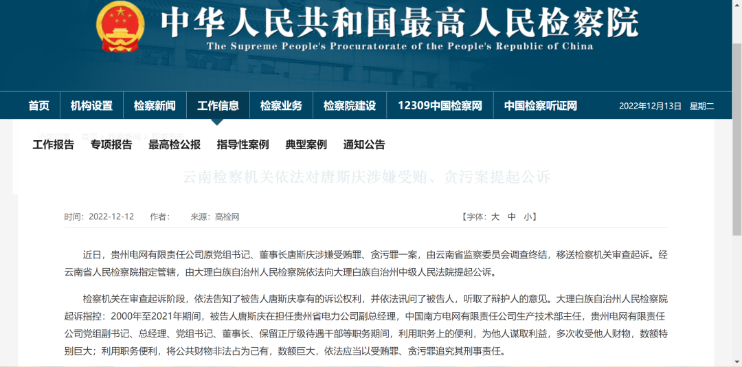 近日,貴州電網(wǎng)有限責任公司原黨組書記、董事長唐斯慶涉嫌受賄罪、貪污罪一案,由云南省監(jiān)察委員會調(diào)查終結,移送檢察機關審查起訴。經(jīng)云南省人民檢察院指定管轄,由大理白族自治州人民檢察院依法向大理白族自治州中級人民法院提起公訴。
