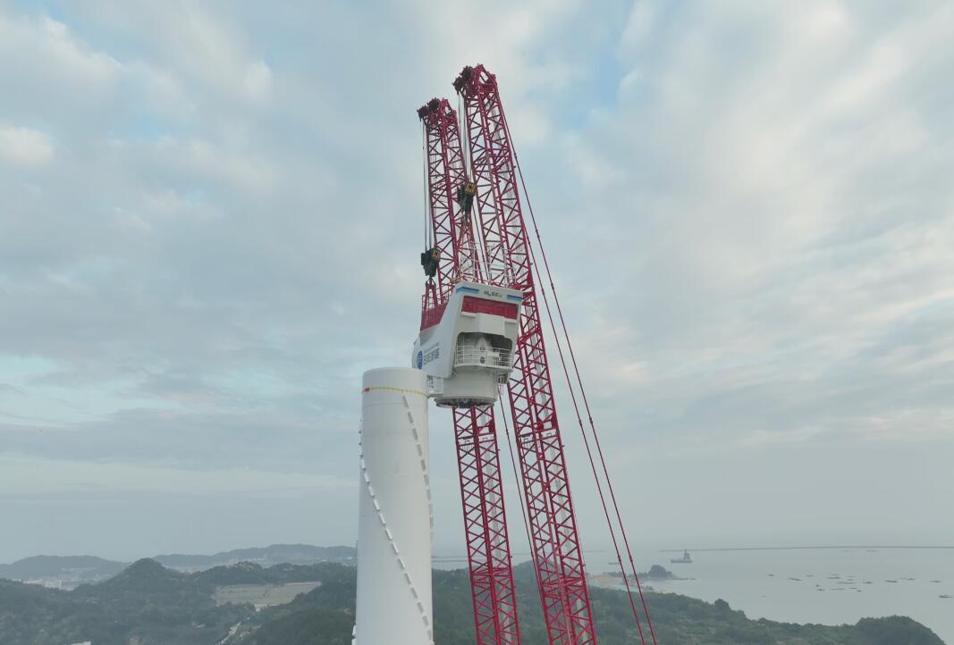 廣東首個風電臨海試驗基地試驗風機吊裝。