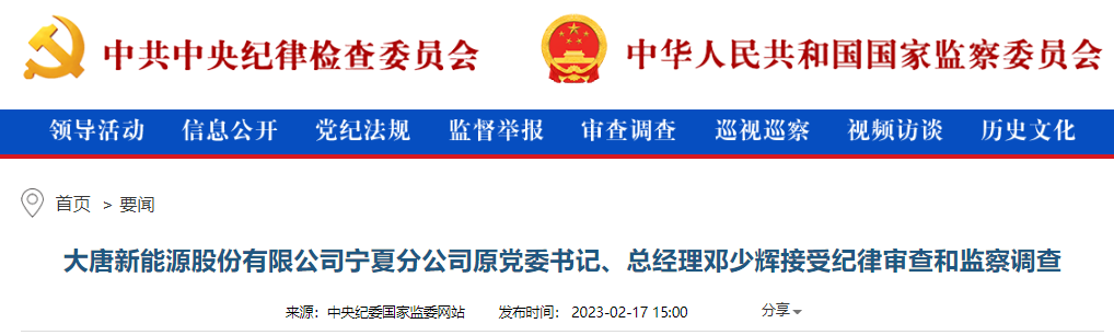 中央紀(jì)委國(guó)家監(jiān)委網(wǎng)站2月17日消息,據(jù)中國(guó)大唐集團(tuán)有限公司紀(jì)檢監(jiān)察組、寧夏回族自治區(qū)監(jiān)察委員會(huì)消息:大唐新能源股份有限公司寧夏分公司原黨委書(shū)記、總經(jīng)理鄧少輝涉嫌嚴(yán)重違紀(jì)違法,目前正接受中國(guó)大唐集團(tuán)有限公司紀(jì)檢監(jiān)察組紀(jì)律審查和寧夏回族自治區(qū)銀川市監(jiān)察委員會(huì)監(jiān)察調(diào)查。