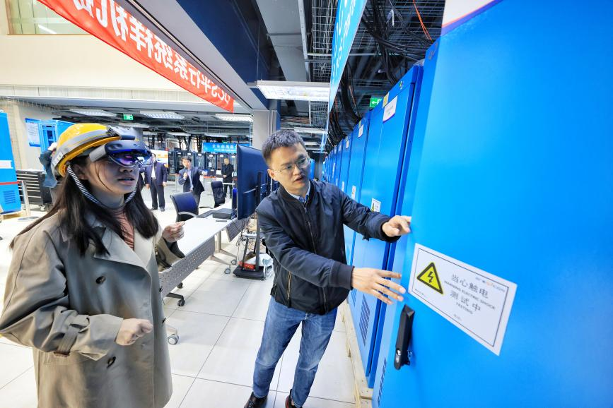 “各位在電視屏幕里看到的,就是在機柜門沒開的情況下,我們工作人員通過智能頭盔眼鏡看到的機柜內(nèi)畫面。”