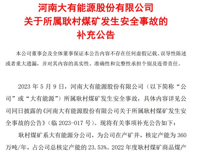 公告顯示,耿村煤礦系大有能源分公司,為公司在產(chǎn)礦井,核定產(chǎn)能為 360 萬噸/年,占公司總核定產(chǎn)能的 23.53%。2022 年度耿村煤礦商品煤產(chǎn) 量 287.45 萬噸,營(yíng)業(yè)收入 13.22 億元,分別占公司同期商品煤產(chǎn)量 的 24.83%和營(yíng)業(yè)收入的 15.39%。2023 年第一季度耿村煤礦商品煤產(chǎn) 量 51.51 萬噸,營(yíng)業(yè)收入 2.15 億元,分別占公司同期商品煤產(chǎn)量的 18.32%和營(yíng)業(yè)收入的 10.73%。目前,耿村煤礦正在組織實(shí)施停產(chǎn)救援,對(duì)公司造成的影響暫無法預(yù)測(cè)。公司將持續(xù)關(guān)注事故后續(xù)進(jìn)展并及時(shí)履行信息披露義務(wù),敬請(qǐng)廣大投資者注意投資風(fēng)險(xiǎn)。