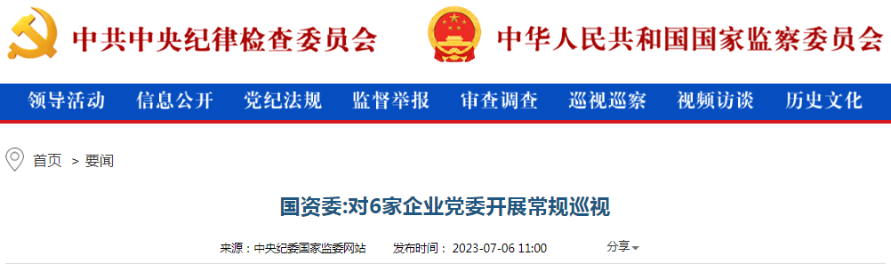 中央紀(jì)委國家監(jiān)委網(wǎng)站7月6日消息,經(jīng)國資委黨委批準(zhǔn),2023年第一輪巡視對中國化學(xué)工程集團有限公司、中國鐵路工程集團有限公司、中國鐵道建筑集團有限公司、中國交通建設(shè)集團有限公司、中國電力建設(shè)集團有限公司、中國能源建設(shè)集團有限公司等6家企業(yè)黨委開展常規(guī)巡視。